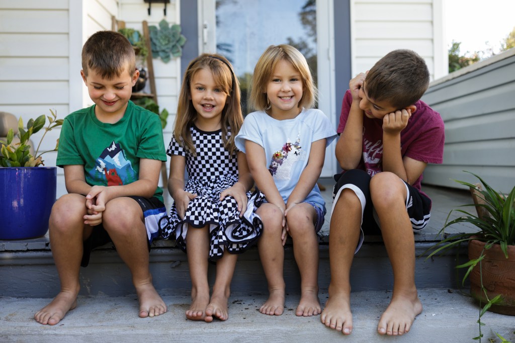 Two attempts at a “first week of school” photo – both times battling a cranky child. P (4th grade) wearing his newly sorted-into-Hogwarts-Gryffindor-House shirt, A (2nd grade technically, but doing mostly 3rd grade work) always in green, N (Kindergarten and So Excited About It) joyfully wearing (and re-wearing) her favorite “chess board” dress, and E (pre-K) somehow always looking bigger than N in photos.