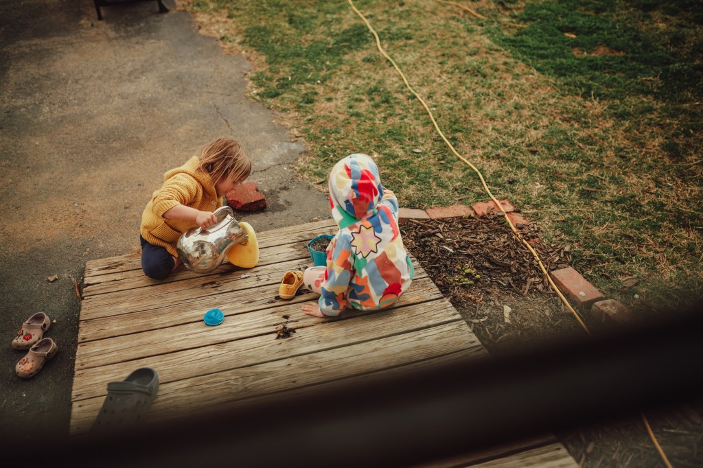 All that typing and I’m realizing this photograph doesn’t even include the mud kitchen itself. But suffice it to say, it’s getting used a lot and I’m very glad I decided to buy one. Birthday gifts can be so difficult. In this photograph, E and cousin R were discussing their creations as E filled up (yet another) pitcher of water to carry over to the kitchen. I think I need to buy her a water barrel.