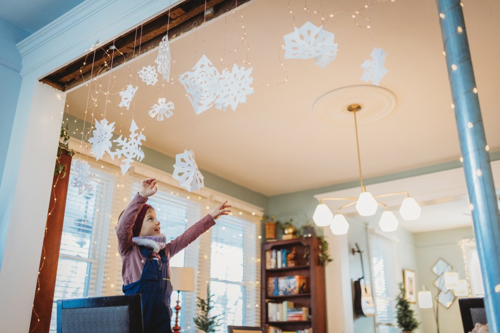 The night before her birthday she went to bed sad because “we forgot to decorate.” In true guilty mom fashion, I then spent two hours cutting out snowflakes and a banner and decorating them with twinkly lights. Her joyful reaction made it all worth it, though, and now that there’s snow on the ground, we’re all still enjoying the fluttering paper flakes. Bonus: it almost makes you forget that there’s an overhead trim piece ripped out showing off the innards of an ash crusted beam and a (newly inserted), metal support beam blocking a previous walkway.