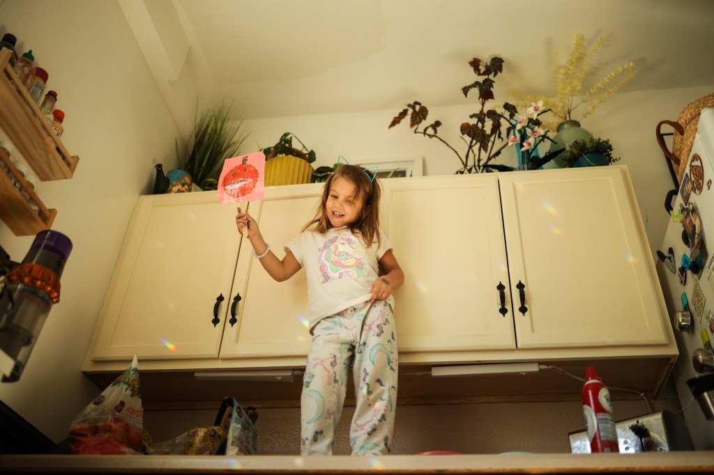 It’s a new, favorite trend for N to make little signs signaling whatever she is excited about (guessing this is what comes from taking kids to protests?! This particular sign was in jubilation of going pumpkin picking soon). Sign plus bouncing rainbows from my window crystal = a dance party in the kitchen.